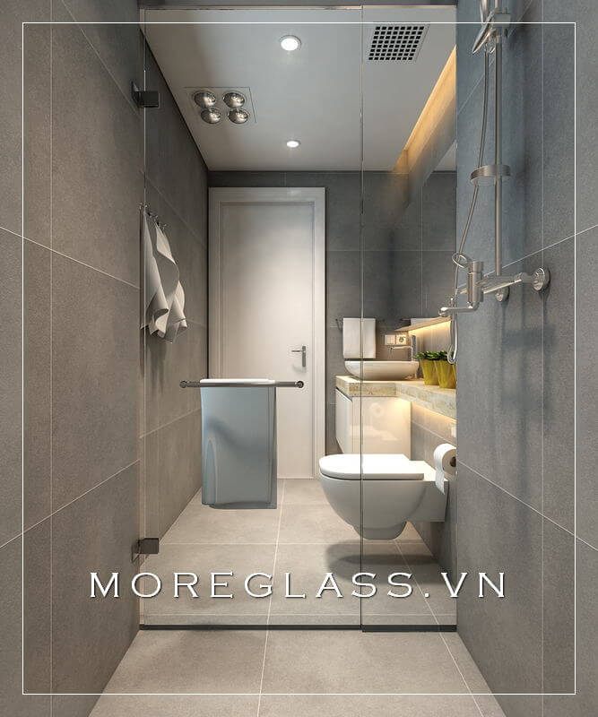 Thiết kế và thi công phòng tắm kính cường lực cửa trượt hiện đại tiết kiệm không gian.
