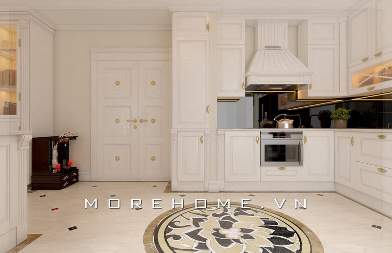 Chỉ với 1 hàng đường thẳng duy nhất, các kiến trúc sư MoreHome thiết kế hệ thống tủ bếp tiện nghi từ gỗ tự nhiên kiểu tân cổ điển đã giúp căn bếp tiện nghi hơn
