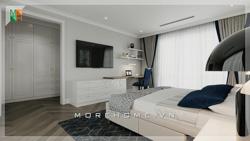 Thường với xu hướng thiết kế nội thất mở, bạn sẽ đi thẳng từ phòng ngủ đến phòng tắm nhưng với cách bố trí tủ quần áo như trên thì việc bố trí lối đi qua phòng thay đồ rồi đến nhà tắm là một ý tưởng khá khéo léo.