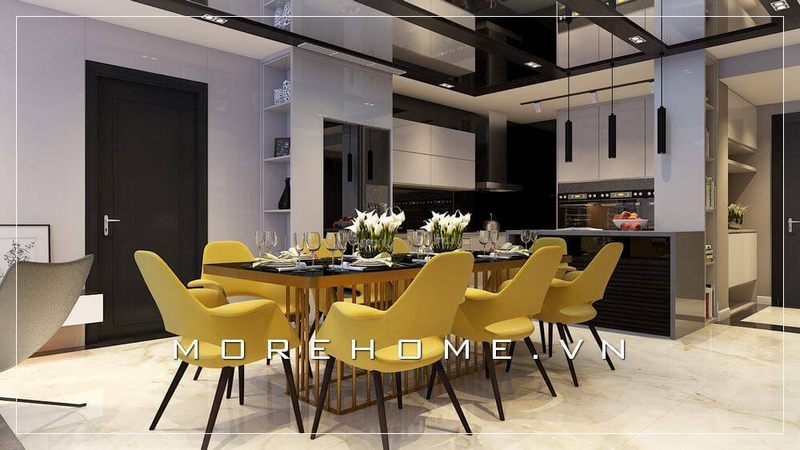 Bộ bàn ăn với sự tương phản màu sắc, cùng đường viền kim loại trang trí như là điểm nhấn cho sự cuốn hút giữa không gian phòng bếp hiện đại
