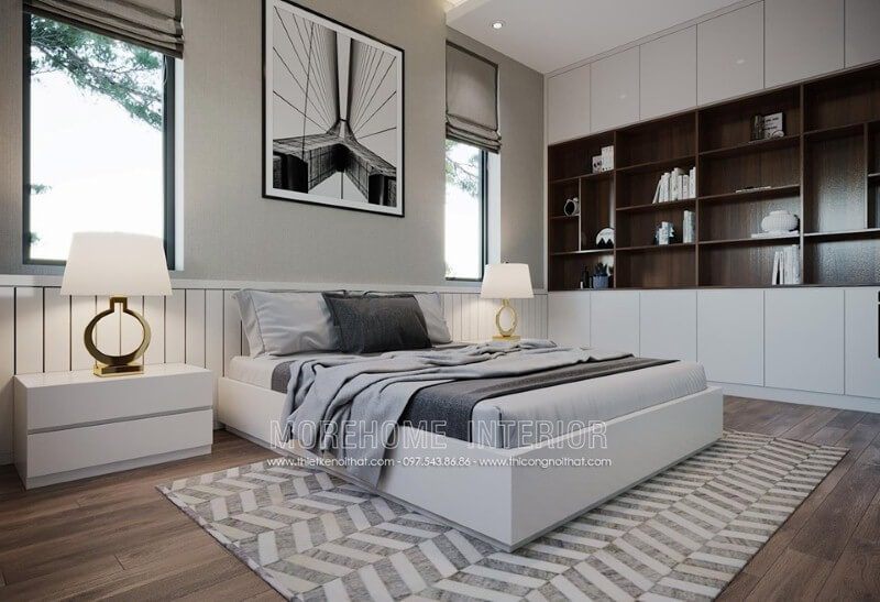 Trang trí phòng ngủ đẹp, thông thoáng bởi cửa sổ 2 bên từ kính cường lực cùng rèm che chắn.