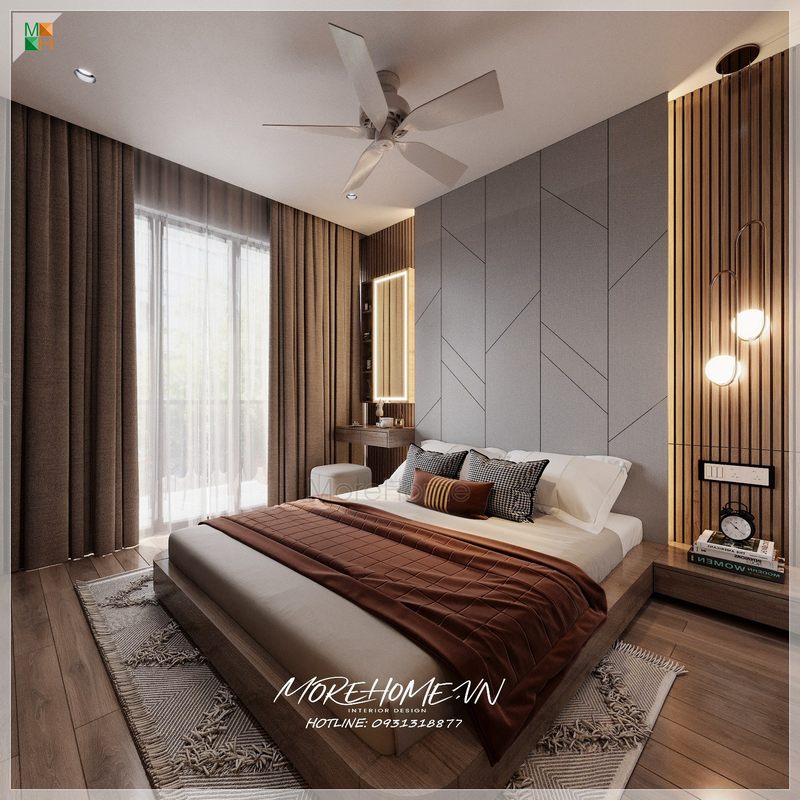 Mẫu giường ngủ hiện đại với tone màu nâu trầm chủ đạo thích hợp cho phòng ngủ người già, người lớn tuổi