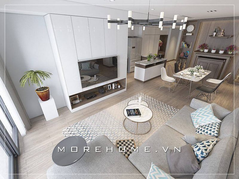 Mẫu thiết kế nội thất chung cư hiện đại sử dụng gam màu sáng làm chủ đạo như: màu trắng, be, màu cát, ghi giúp không gian trở nên thoáng mát, trẻ trung, sang trọng hơn