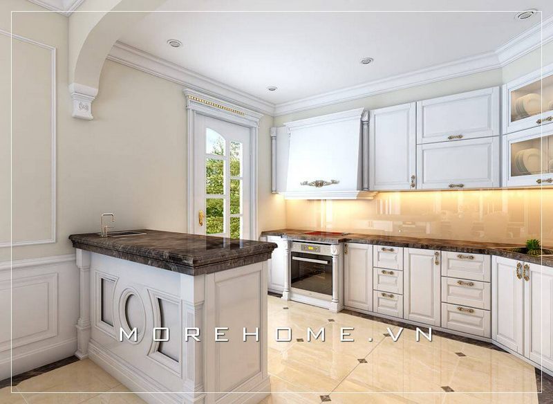 Khu vực bếp tân cổ điển được lắp đặt quay lưng với cửa ra vào cho phép đảm bảo luồng khí phong thủy đi đúng hướng, đem tới nhiều tài lộc cho gia chủ