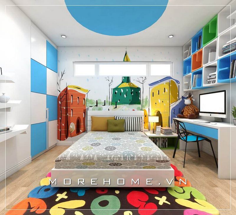 Nội thất phòng ngủ gỗ công nghiệp hiện đại, kết hợp với màu sắc trẻ trung, tươi mới tạo cảm giác thích thú và sinh động hơn tại phòng ngủ bé trai