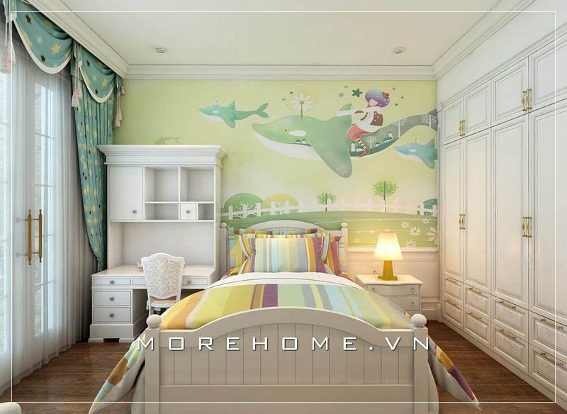 Trang trí nội thất phòng ngủ con ấn tượng với giường ngủ màu trắng sữa, kết hợp đồ nội thất khác tạo nên sự năng động và trẻ trung