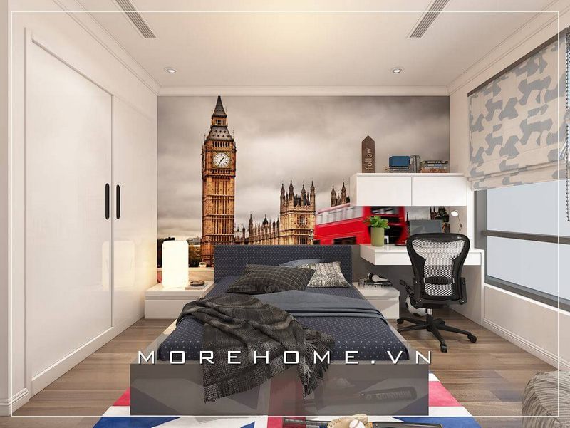 Thiết kế nội thất phòng ngủ bé trai phong cách hiện đại, chát liệu gỗ công nghiệp phù bóng gương tạo độ thoáng hơn cho căn phòng