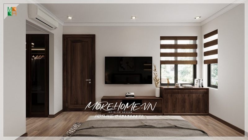 Sử dụng kệ tivi trong phòng ngủ đồng nhất với màu nội thất, làm nổi bật không gian một cách nhẹ nhàng mà tinh tế