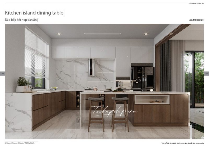 Thiết kế phòng bếp có tủ bếp chữ L có bàn đảo bếp tân cổ điển bằng gỗ óc chó tự nhiên cao cấp